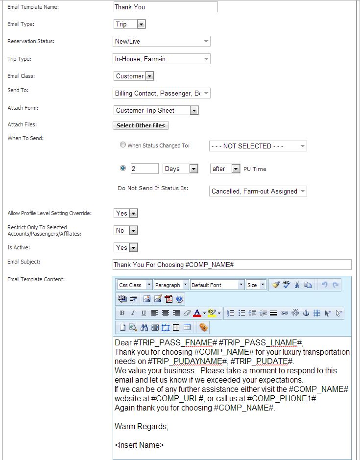 | Reservation Status: | Allows you to specify what type of trips to send the email out on: New/Live are all trips that are not set to a completed status. Settled are all trips that have been settled. |