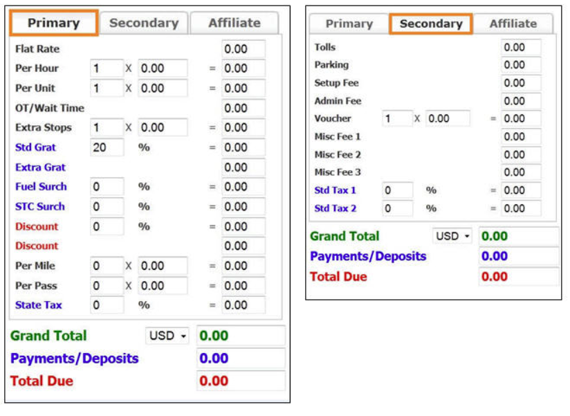 - System Rate Manager provides for a method to establish and manage the base rate, gratuity, miscellaneous fee, surcharge, discount, and tax fields that will be present in the primary and secondary tabs in the rate construction portions of the Reservation and Settle processes. The default Reservation rate construction tabs are shown here. These are the rate fields that are default in Limo Anywhere.