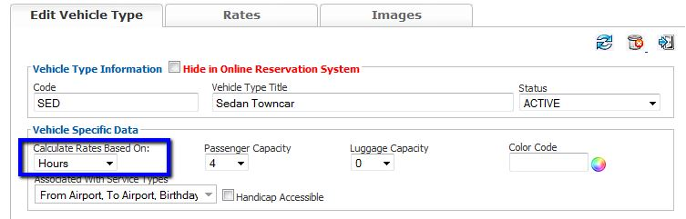 - The Vehicle Type will display in the ‘Edit Vehicle Type‘ section. Ensure that the setting ‘Calculate Rates Based On:‘ is set to Hours as illustrated below.