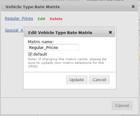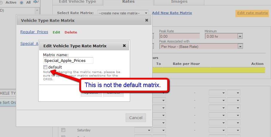 IMPORTANT NOTE: There can only be one Default Rate Matrix, which should be the basic Rates that regular customers (non special pricing customers) would get, you will need to set up ALL of your vehicle types Hourly and Per Passenger rates under the SAME ‘Default Rate Matrix’. If you have special pricing matrices you will need to set up ALL of your vehicle types Hourly and Per Passenger rates under each matrix.