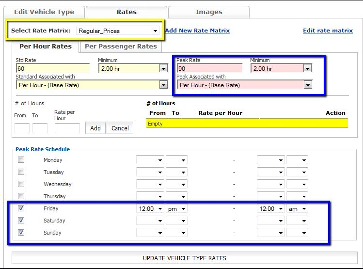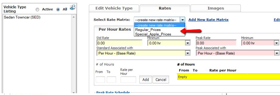 - Select the rate matrix you would like to changes the hourly prices on from the ‘Select Rate Matrix:‘ drop down box as illustrated below.