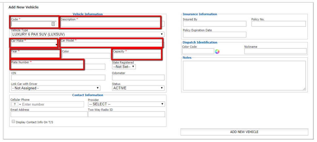 - Enter the Vehicle’s Information such as Code, Description, Car Make, Vehicle Type, Car Make, Car Model, Year, Passenger Capacity and Plate Number.