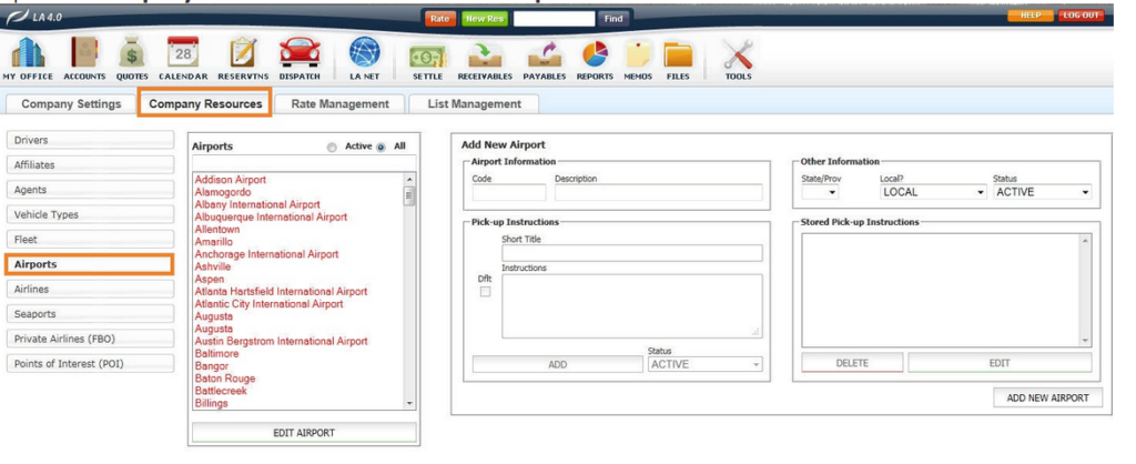 Limo Anywhere comes with most United States commercial Airports established in the system. In a new system the pre-populated Airports will all be in RED font indicating their status is ‘INACTIVE‘.