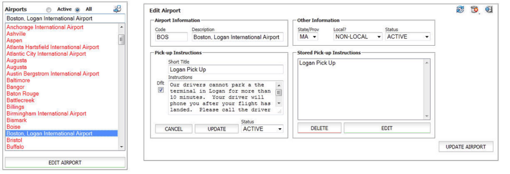 - As mentioned before, Limo Anywhere comes with most US Airports loaded in an INACTIVE status as indicated by the RED font. In the example below, Boston (Logan International Airport) will be activated.