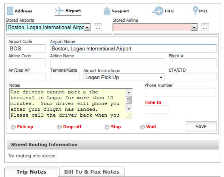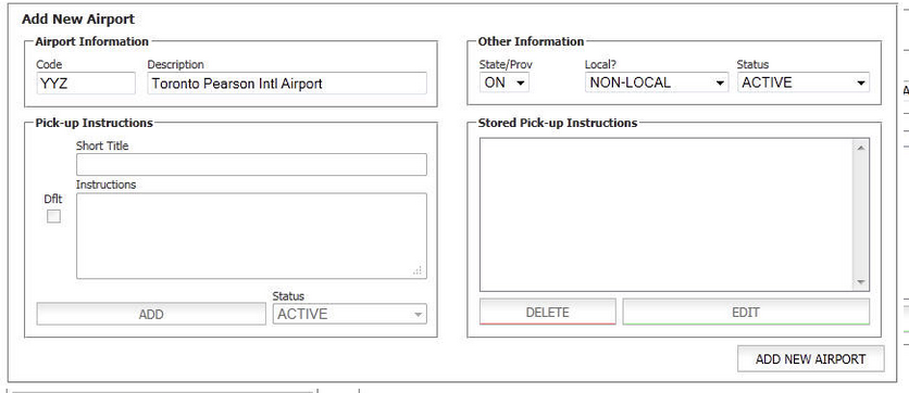 - Pick-Up Instructions are optional but can be valuable because when they are entered and set as ‘default’; the Pick-Up Instructions will automatically populate in to the Notes field in the Reservation routing when the Airport is selected, and appear on Confirmations and Trip Sheets.