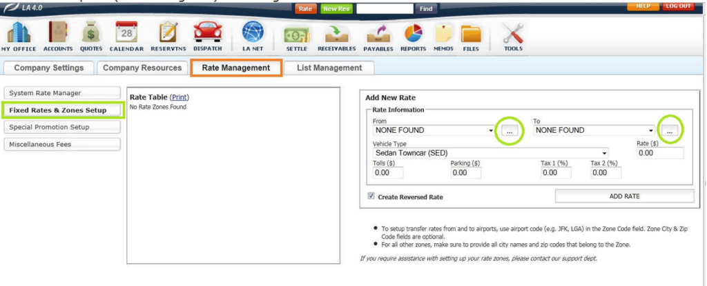 - Open the Rate Management tab and select the ‘Fixed Rates & Zones Setup‘ button.