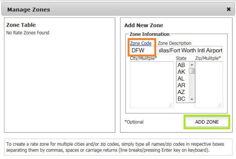- The Manage Zones pop up window will display. The first zones that need to be added are for all airports that will be in the company’s Fixed Rate & Zones structure thus establishing those airports as Zones.