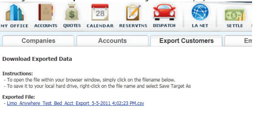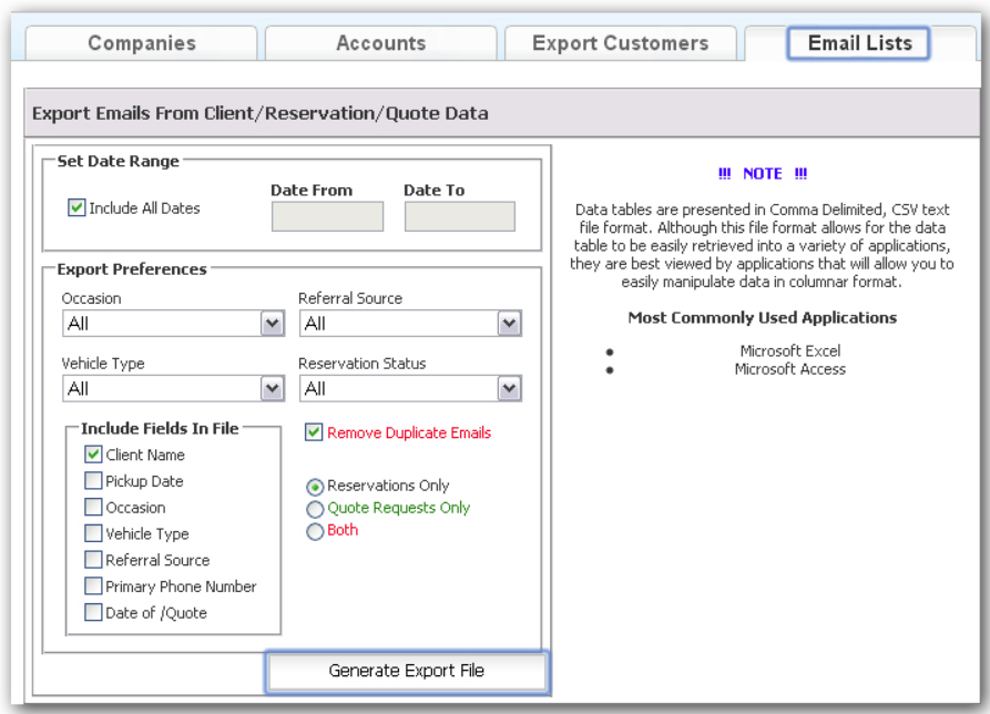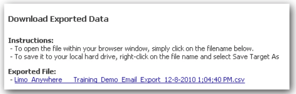 Exporting Customer Data out of Limo Anywhere allows the creation of files that can be used to facilitate marketing efforts, import into other programs such as an email utility, or create helpful back up files that can be used should internet service be interrupted.