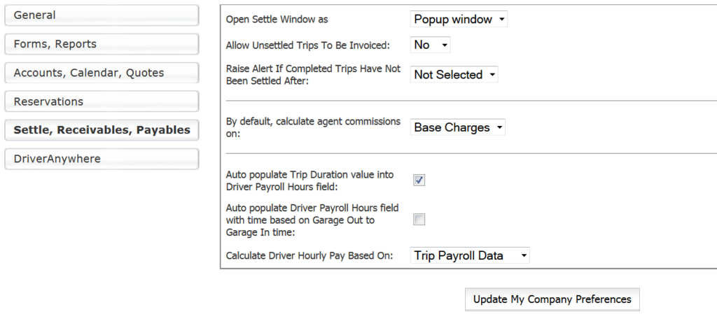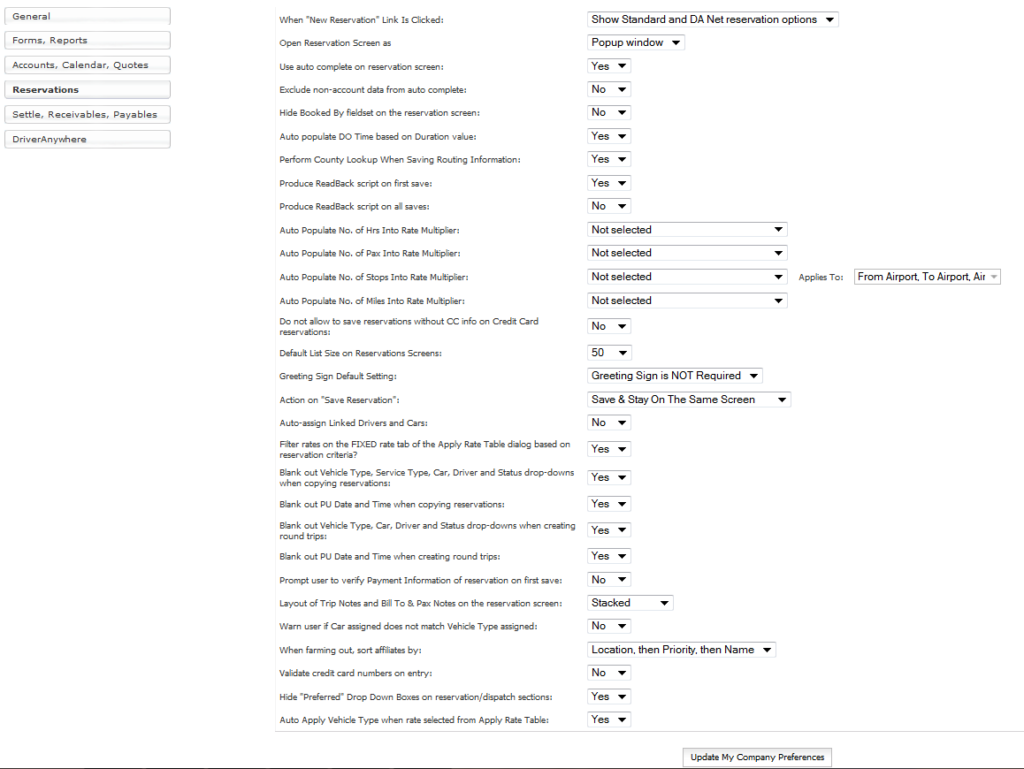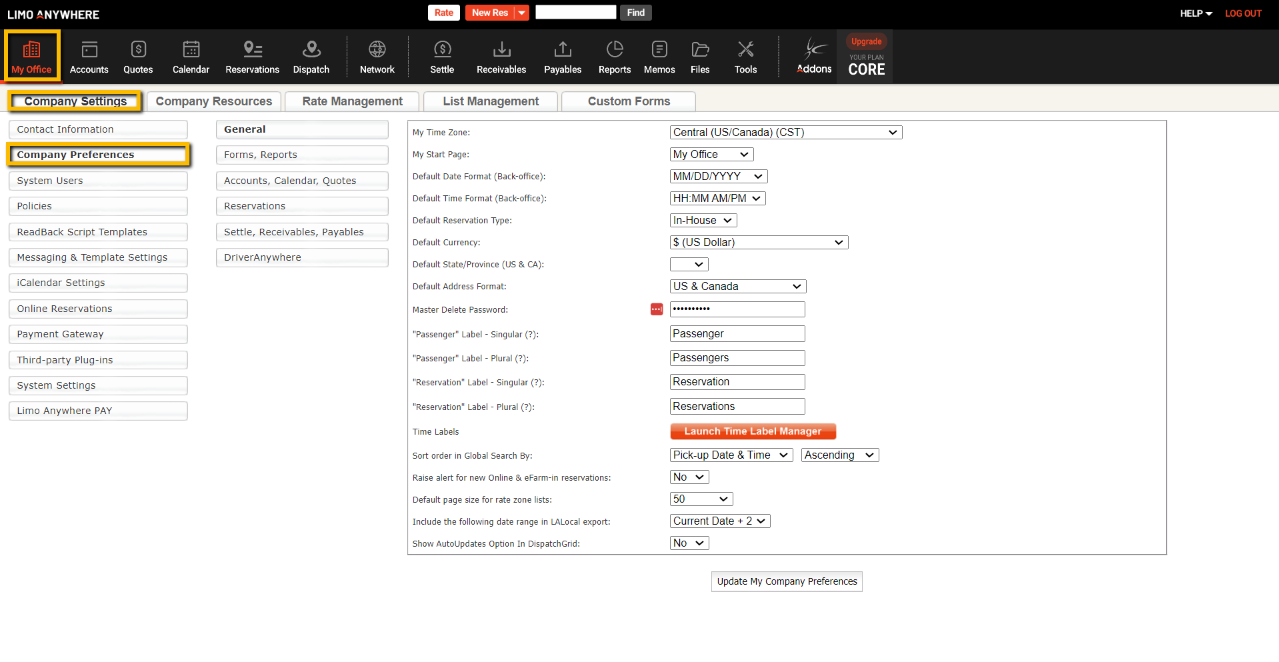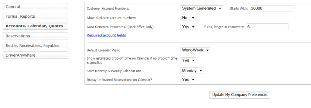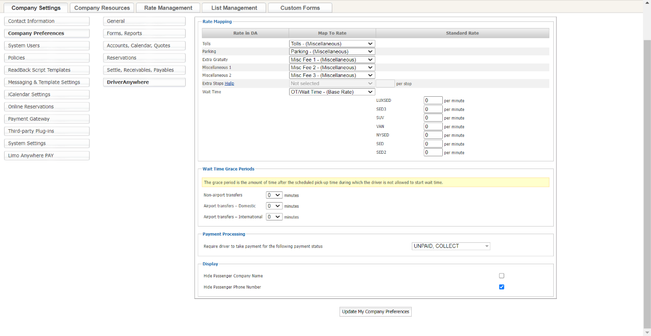 Company Preferences control a great number of the aspects of Limo Anywhere, and the settings here allow the customization of Limo Anywhere to fit the company’s needs.