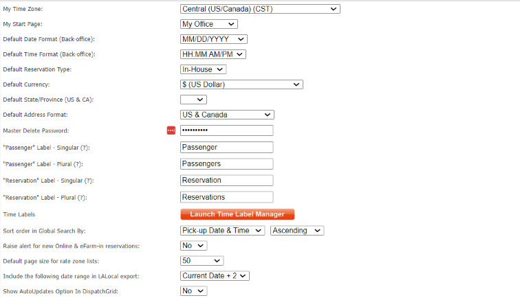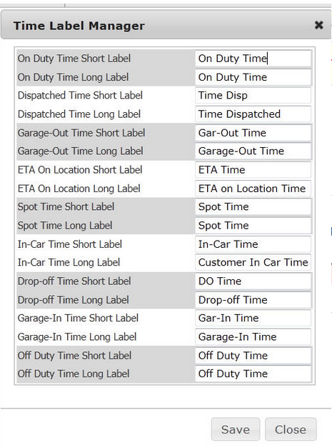 Change the way the Time Label will appear in the company’s Limo Anywhere by entering in the new name in the right and column for that Time Label. See the article Setting Up Time Label Management for details.