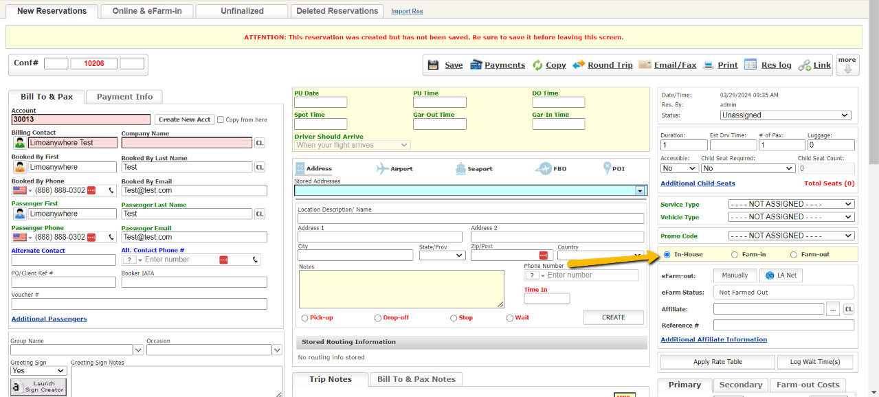 - Default Reservation Type: <In-House> Select ‘In House’ if most reservations made by the company are performed by the company vehicles and staff. Choose ‘Farm In’ if most reservations come from affiliate companies. Choose ‘Farm Out’ if most reservations made by the company are performed by affiliate companies. This selection is on the Reservation screen as illustrated below where the ‘In House’ selection has been made.