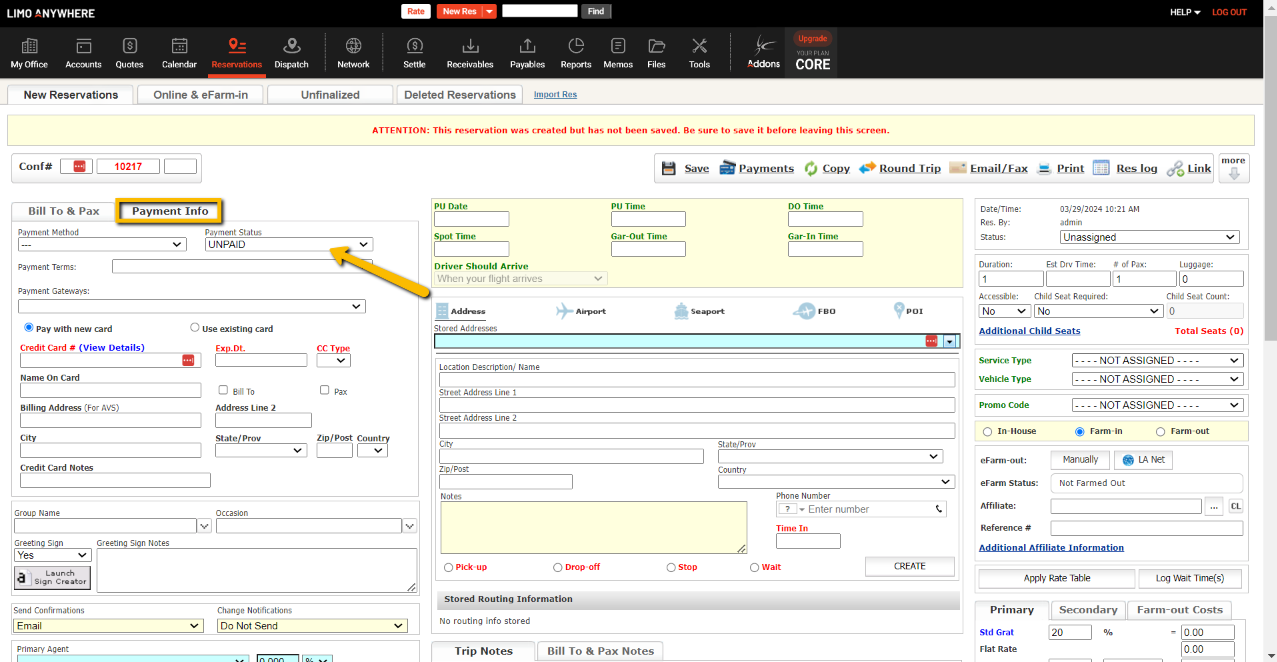 - Unpaid & Collect: Allow your drivers to collect payments for Reservations that have either Unpaid or Collect as the Payment Status. You can see where the payment status is located on a reservation in the screenshot below.