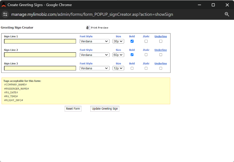 Change the content on the lines 1, 2 or 3 by entering text or selecting one of the tags to populate the sign with information form the reservation. Select the Font Style, Size, and effect (Bold, Italic, or Underline) if desired.