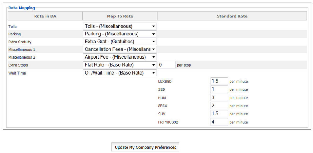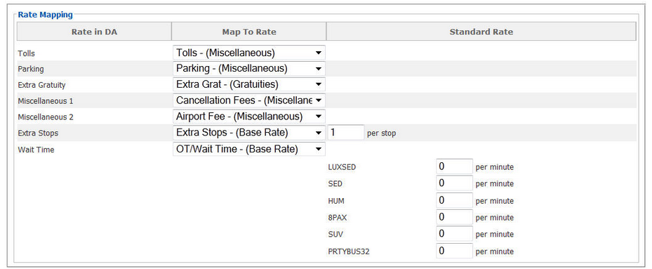First select for each Driver Anywhere Rate a corresponding rate from the drop down list. When each rate is done the Driver Anywhere Rate Mapping may appear as below.