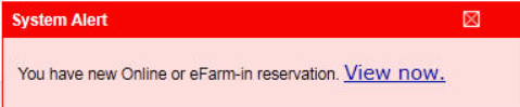 - Raise alert for new Online & eFarm-in reservations:<No> Select Yes or No. Selecting ‘Yes’ adds a red Alert Box to the lower right side of any screen to alert the user that there are new online reservations awaiting a response. Illustrated below is the Alert Box.