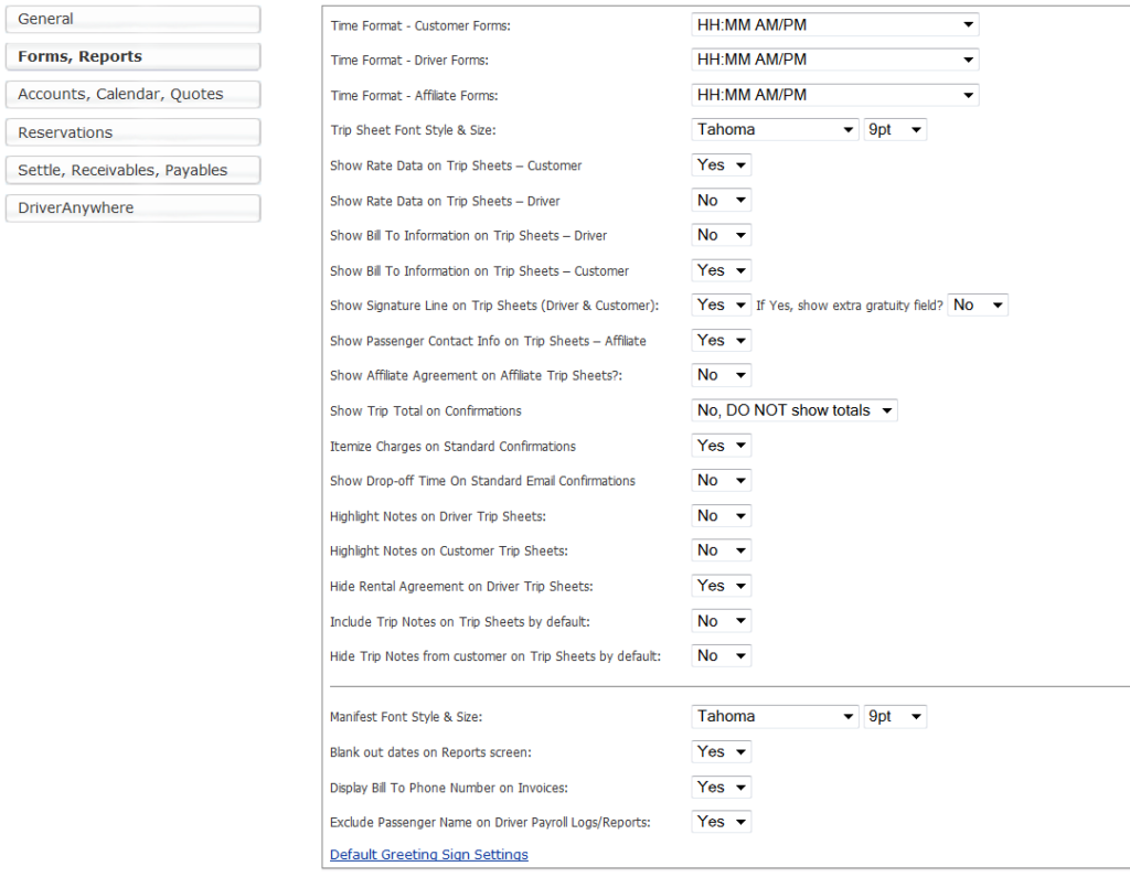 - Time Format: Driver Forms: <HH:MM AM/PM> Choose from four formats of minutes, hours and AM/PM as best suits the drivers of the company. This format will be used only on the Limo Anywhere generated forms for drivers such as the Driver Trip Sheet. This setting also applies to Scheduled Email Module Templates, and Custom Forms that are designated as Driver class.