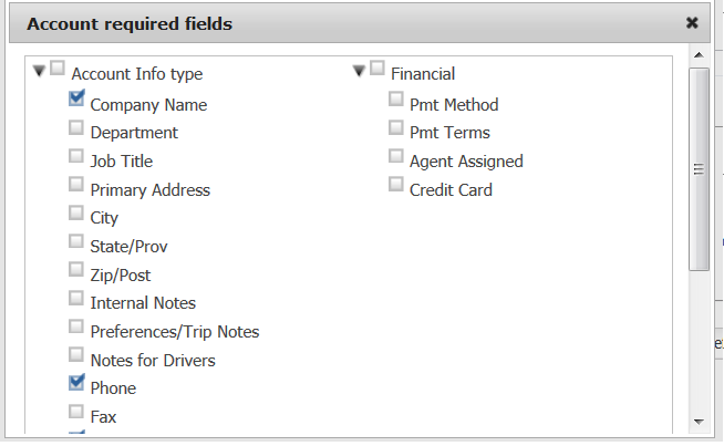 - Required Account Fields link. Click to display this window. Click to select which fields of information are required to save a new account.