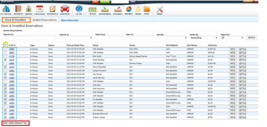 - Select the reservations or trips that are to be Batch Settled by clicking the check box to the left of each confirmation number (highlighted blue). In this example all the reservations with $0.00 in the Total Due column have been selected.