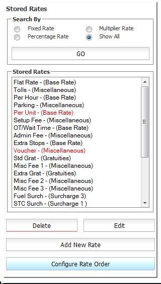 NOTE: Making changes to this section will affect your stored driver payroll, stored special account rates, promo code rates, miscellaneous fee rates, and anything else that has to do with using rate fields. You will need to check all the above sections to insure the change you made does not negatively affect your pricing structure.