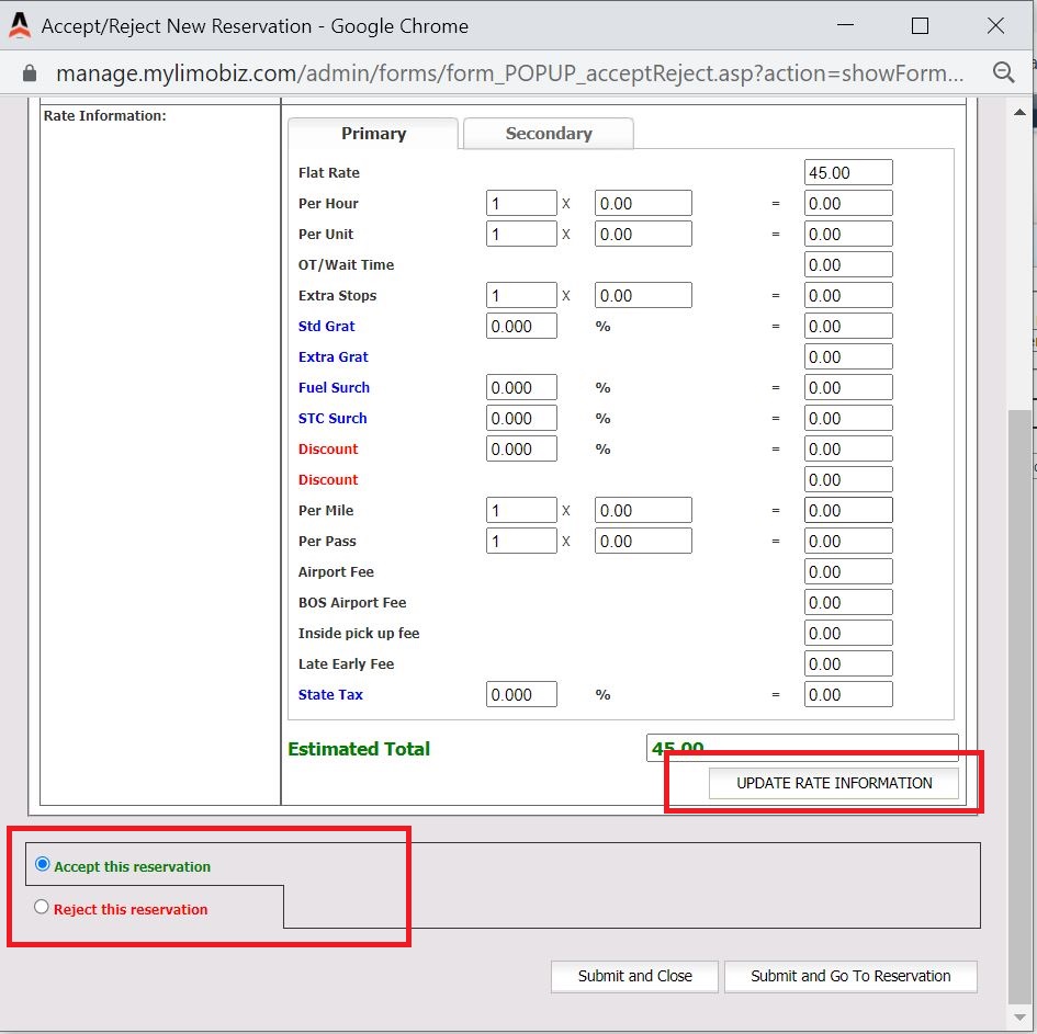 - At the bottom of this pop up window select either ‘Accept’ or ‘Reject’ radio button. If you make changes to the rates click the button labeled ‘Update Rate Information‘ save the changes made to the rates for this reservation.