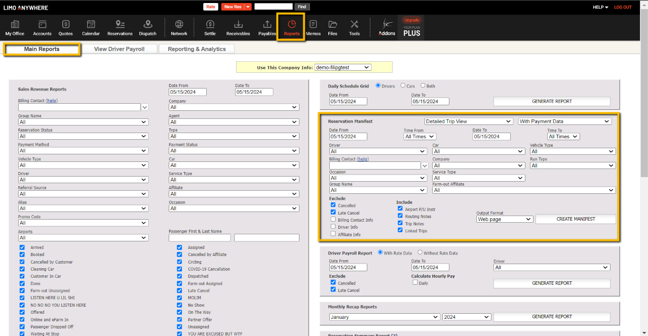 - Find the Reservation Manifest Report creation box (2nd option from the top in the right hand column).