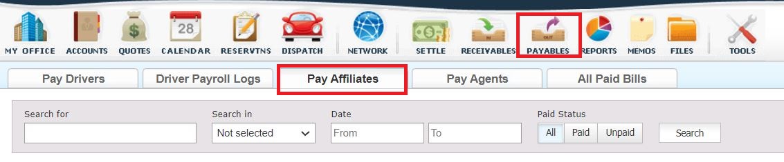 This article details how to pay your Affiliates. Before Affiliate Pay can be processed each trip must be settled. For detailed instructions on settling see the Knowledge Base article How to Settle a Reservation. During the Settlement process the applicable Affiliate Pay rates for a trip will be processed automatically if those rates were in the reservation correctly. Affiliate pay is reviewed in this settlement screen ‘Pay Affiliates’.