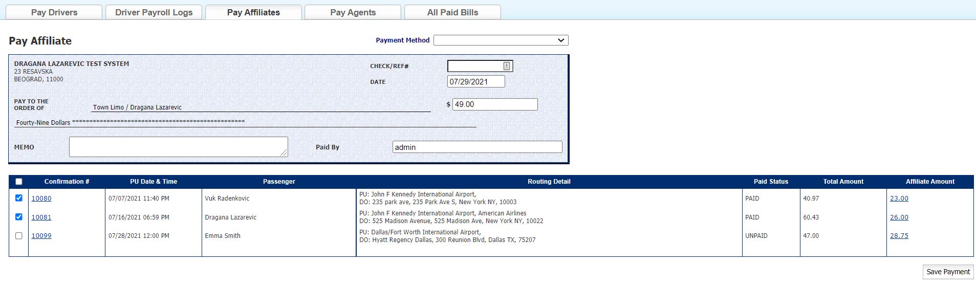 - Click ‘PAY AFFILIATE’ to include all trips; or select the trips to be included in this Affiliate pay by clicking the check box next to the confirmation number, and clicking the “PAY SELECTED” button.