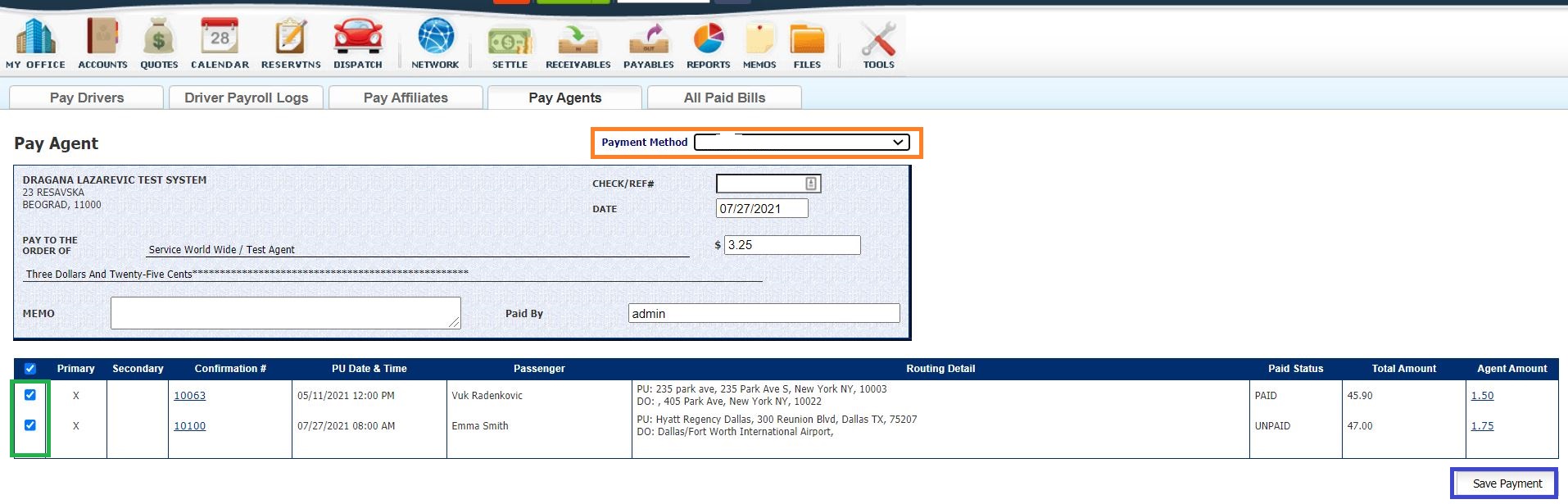 - Click the check box next to each trip you wish to pay the agent for (highlighted green).
