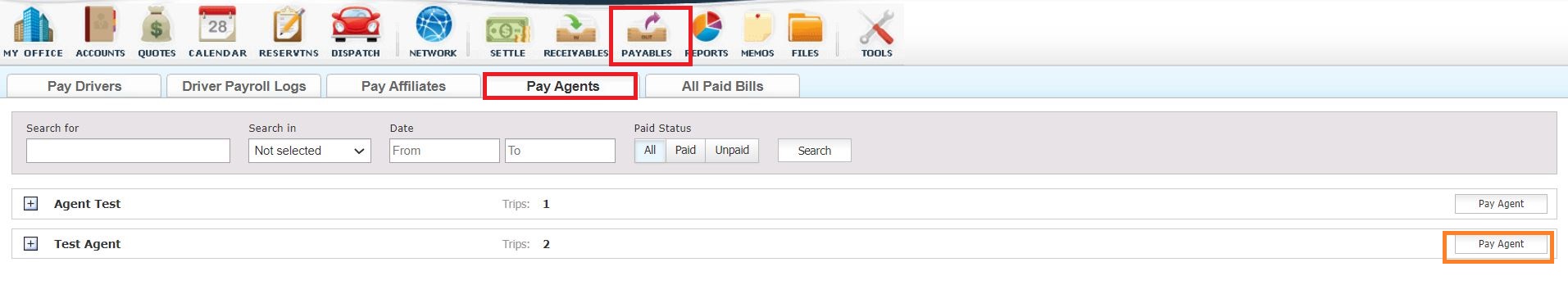 - Next step is to click on the Payables icon on the Limo Anywhere toolbar and Select the Pay Agents tab.