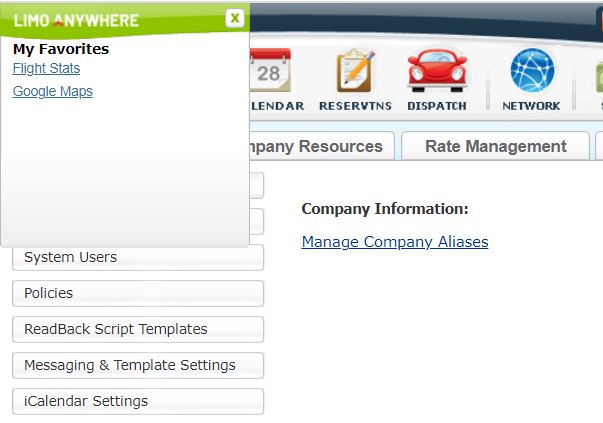 This was a Favorite feature of a number of operators who used the original version of Limo Anywhere and we received a number of requests to add it back. The the Favorites URL list entered into Limo Anywhere can be accessed by clicking on the ‘Limo Anywhere’ logo in the top left corner of the screen directly above the ‘My Office’ icon on the limo Anywhere toolbar.