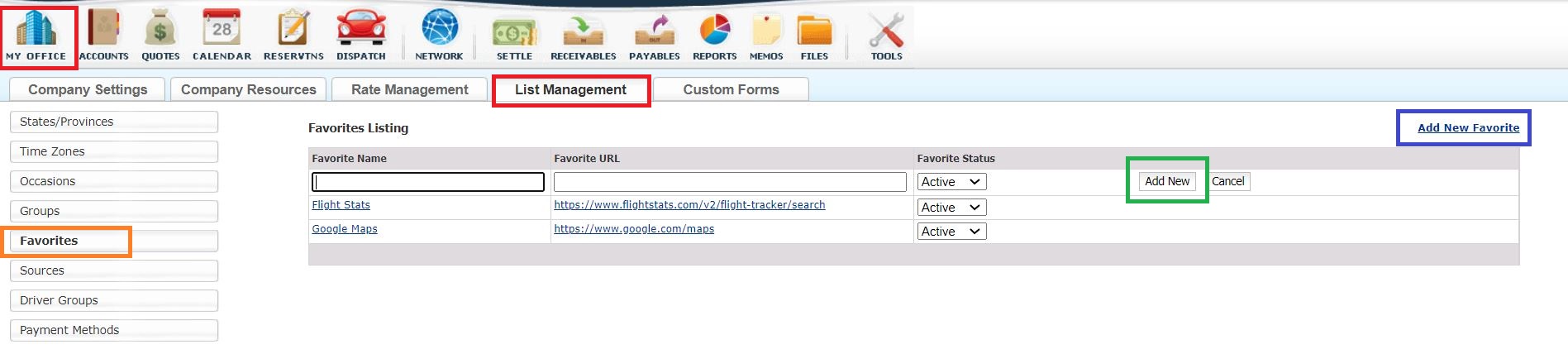 Managing the Favorites List in Limo Anywhere